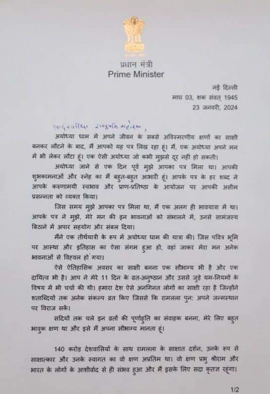 प्रधानमंत्री श्री नरेन्द्र मोदी ने आज श्री राम जन्मभूमि मंदिर में हुए प्राण प्रतिष्ठा समारोह के संबंध में भारत की माननीया राष्ट्रपति द्वारा लिखे गए पत्र पर अपना जवाब साझा किया-